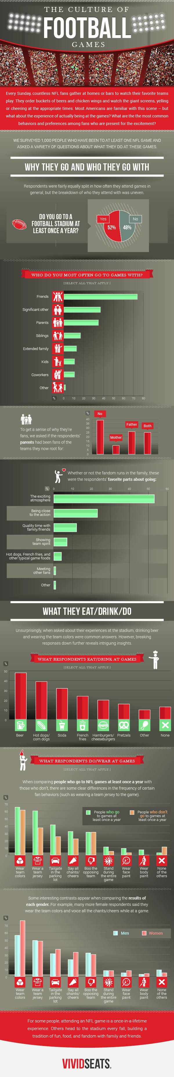 In the spirit of tradition-steeped football fandom, we wanted to know more about these stadium visits: How often do fans make it to games, and who do they attend with? Which stadium foods do they snack on? Do they wear team colors, tailgate in the parking lot, or boo the other team? To get the details, we surveyed 1,000 football fans who've attended at least one NFL game. Here's what we found out.