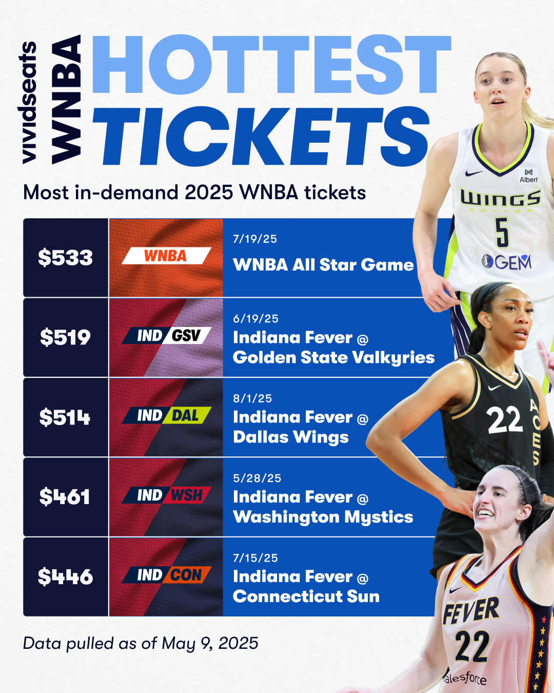 Download the Vivid Seats app, available on iOS and Android, to find tickets to the hottest WNBA matchups this season.